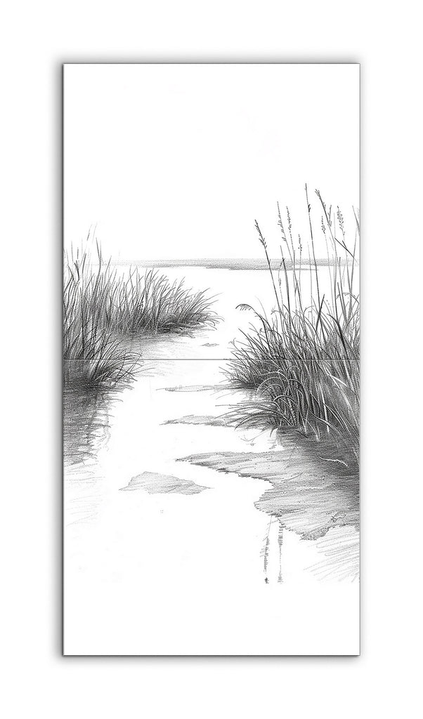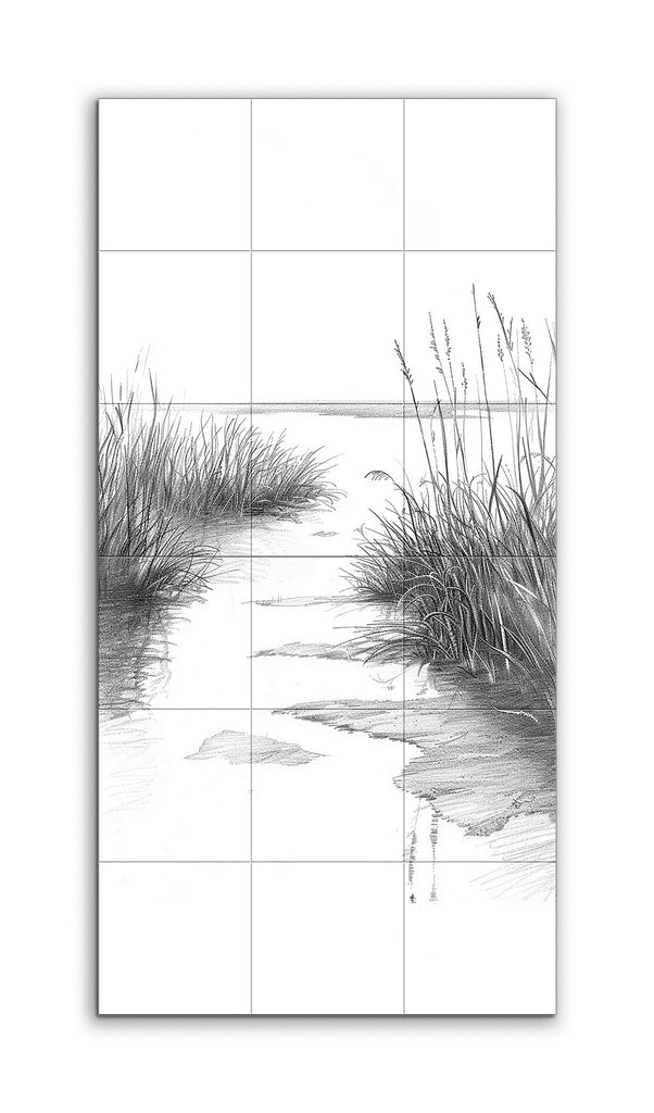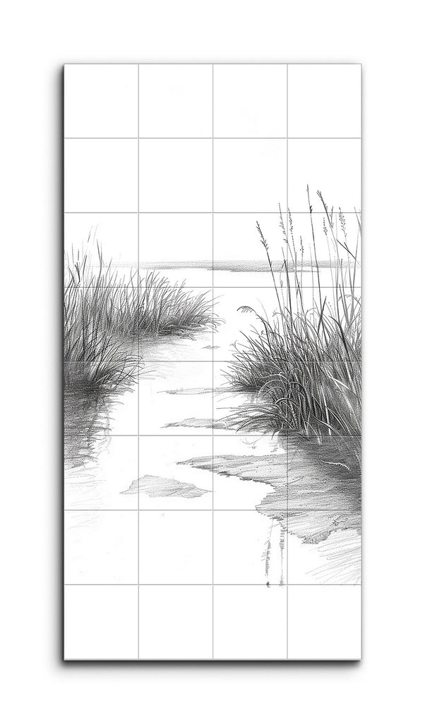 Diese monochrome Bleistiftzeichnung fängt eine ruhige Naturlandschaft mit exquisiten Details ein. Ein kleiner See oder Teich ist von hohen Gräsern und Schilf umrahmt, die mit feinen, zarten Strichen dargestellt sind, die eine lebensechte Textur und ein Gefühl von Bewegung hervorrufen. Das ruhige Wasser, mit seinen subtilen Spiegelungen und sanften Wellen, trägt zur Gelassenheit bei. Der größtenteils leere Hintergrund verstärkt den offenen Raum und die Friedlichkeit der Szene, während der detaillierte, aber einfache Stil die Tiefe und Dimension dieser ruhigen Umgebung unterstreicht.