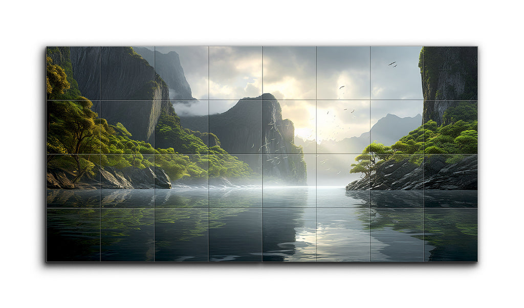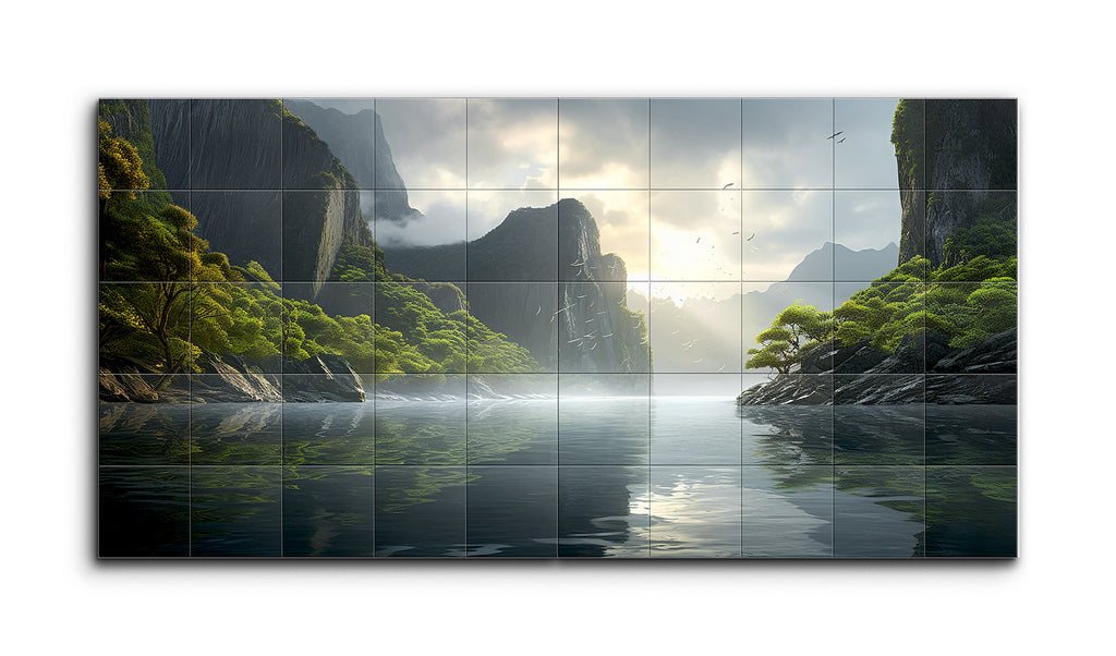 Dieses Fliesenbild fängt eine ruhige Naturlandschaft ein, die von einem friedlichen Gewässer umgeben ist, das von hoch aufragenden, üppig grünen Klippen begrenzt wird. In weiches, diffuses Licht getaucht, wahrscheinlich von einer frühen Morgen- oder späten Nachmittagssonne, die von Wolken verdeckt wird, strahlt die Szene ein sanftes Leuchten aus. Das spiegelglatte Wasser reflektiert die Klippen und den Himmel und verstärkt so die Ruhe. Üppiges Laub klammert sich an die zerklüfteten Klippen und deutet auf ein blühendes Ökosystem hin. Neblige, ferne Berge verleihen der Szene Tiefe und Geheimnis, während Vögel darüber hinwegfliegen und der hyperrealistischen Komposition dynamisches Leben verleihen. Die harmonische Farbpalette aus Grün-, Blau- und Grautönen verstärkt die friedliche Atmosphäre.