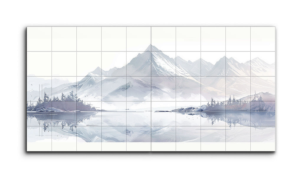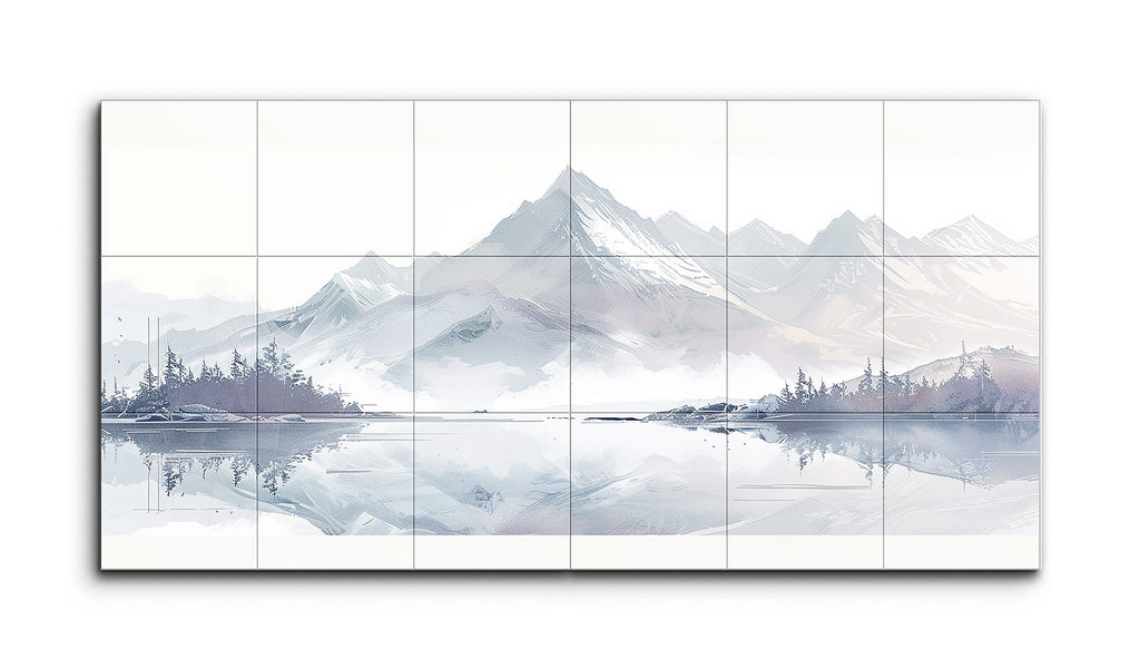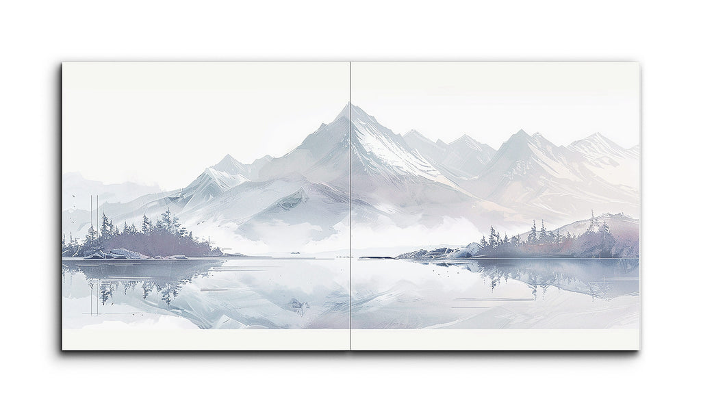 Dieses Diptychon-Fliesenwandbild fängt eine ruhige, kalte Berglandschaft mit einer gedämpften Palette aus sanften Weiß-, Grau- und dezenten Blautönen ein. Die sanften, schwungvollen Pinselstriche schaffen majestätische, schneebedeckte Gipfel und rufen eine Hochgebirgsumgebung hervor. Die Nadelbäume im Vordergrund sind minimal detailliert, während ihre Spiegelungen in einem ruhigen Gewässer die Friedlichkeit der Szene verstärken. Die moderne, minimalistische Ästhetik und die offene Komposition laden zur Betrachtung ein und bieten einen Panoramablick auf unberührte Naturschönheit.