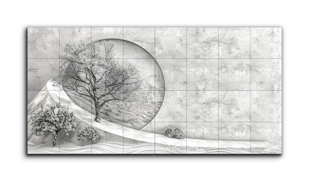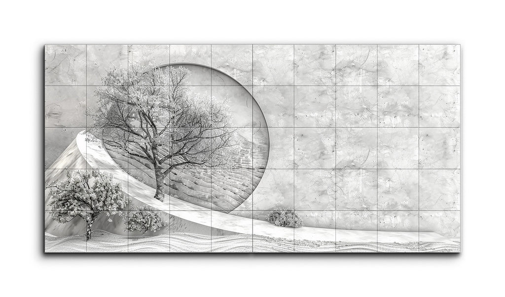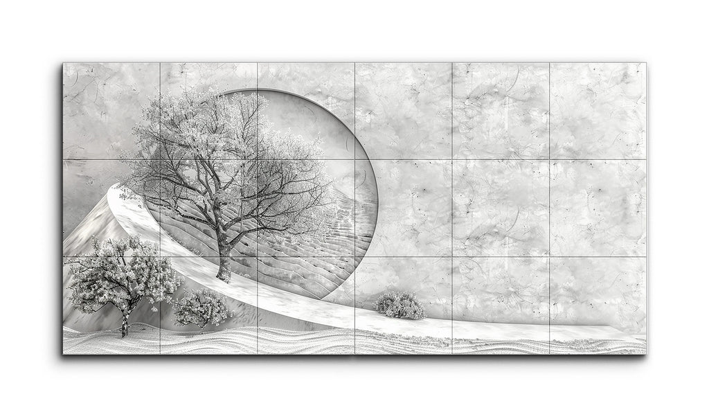 Dieses Fliesenbild präsentiert eine ruhige, monochrome Winterlandschaft. Der Fokus liegt auf einem großen, blattlosen Baum mit kunstvoll verschneiten Ästen, der leicht nach links innerhalb eines kreisförmigen Rahmens positioniert ist. Darunter ist der Boden glatt mit Schnee bedeckt, was Ruhe ausstrahlt. Ein kleinerer, verschneiter Busch links balanciert die Komposition aus. Im Hintergrund sind sanfte, verschneite Hügel zu sehen, die in die Ferne abfallen und Tiefe verleihen. Der minimalistische, aber dennoch detaillierte Stil sowie die monochrome Farbpalette verstärken die friedliche Atmosphäre.