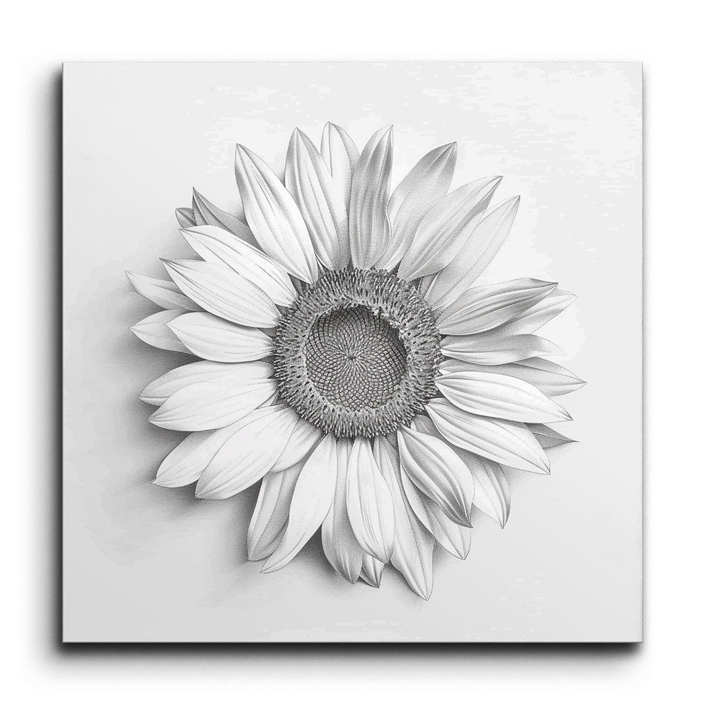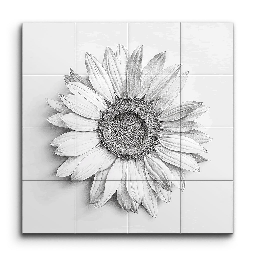 Verwandeln Sie Ihren Raum mit diesem atemberaubenden Fliesenbild in Graustufen, das eine detailgetreu dargestellte Sonnenblume zeigt. Das Kunstwerk fängt die komplexe Struktur der Sonnenblume in exquisiten Details ein, wobei jedes Blütenblatt und die zentrale Scheibe mit feinen Linien und subtilen Schattierungen dargestellt sind. Die realistische, botanische Genauigkeit des Stücks verleiht Ihren Wänden eine klassische, fast fotografische Qualität und betont die Schönheit von Form und Textur in monochromer Eleganz. Perfekt, um jedem Ambiente eine naturinspirierte Raffinesse zu verleihen.