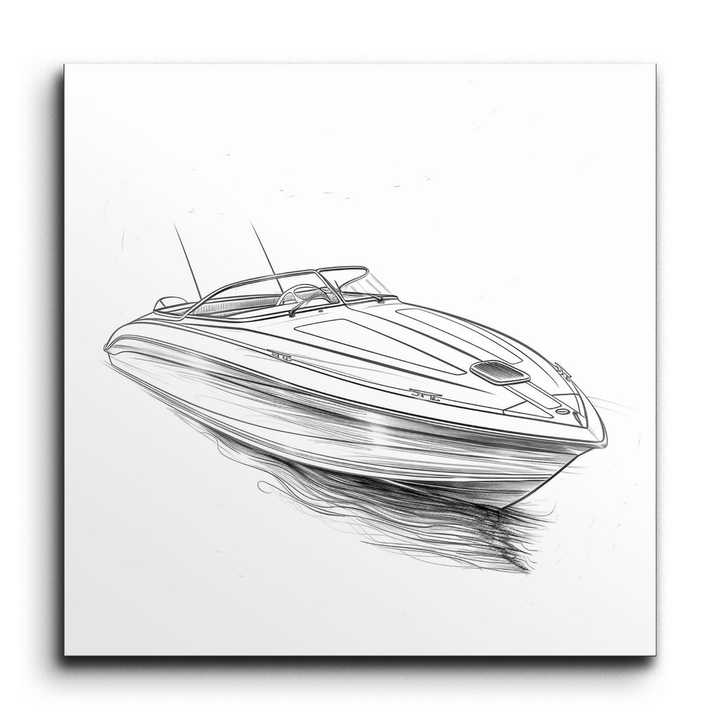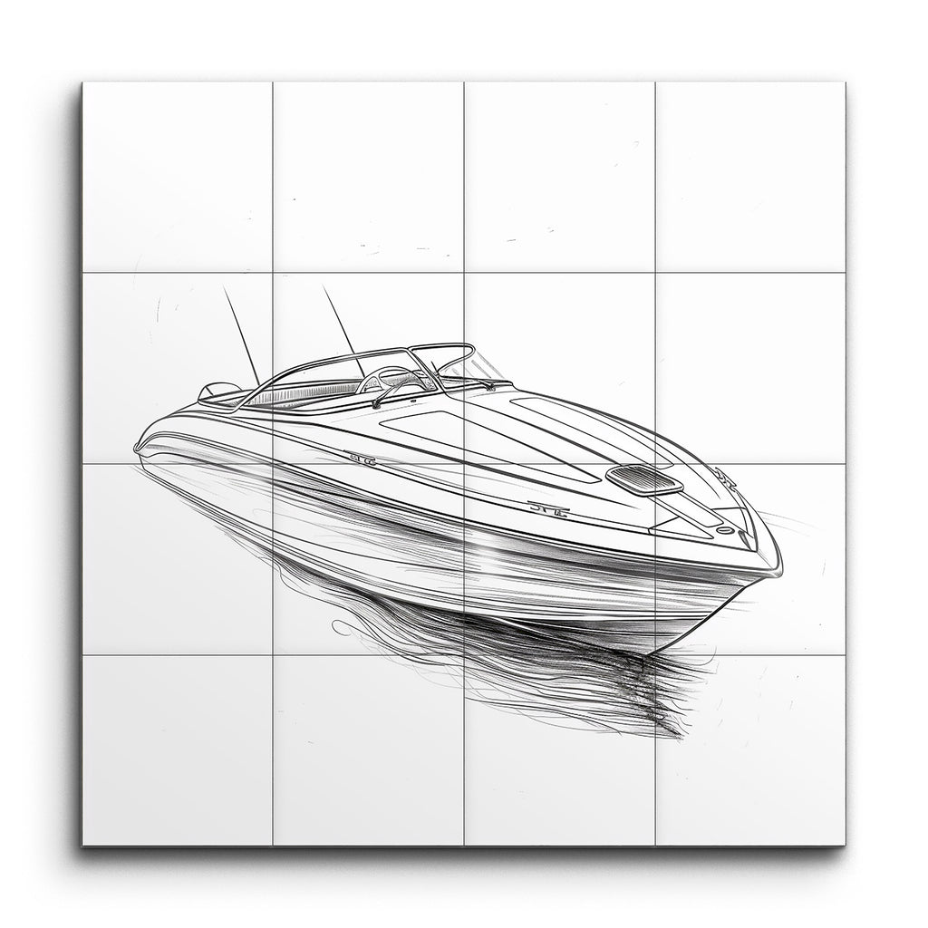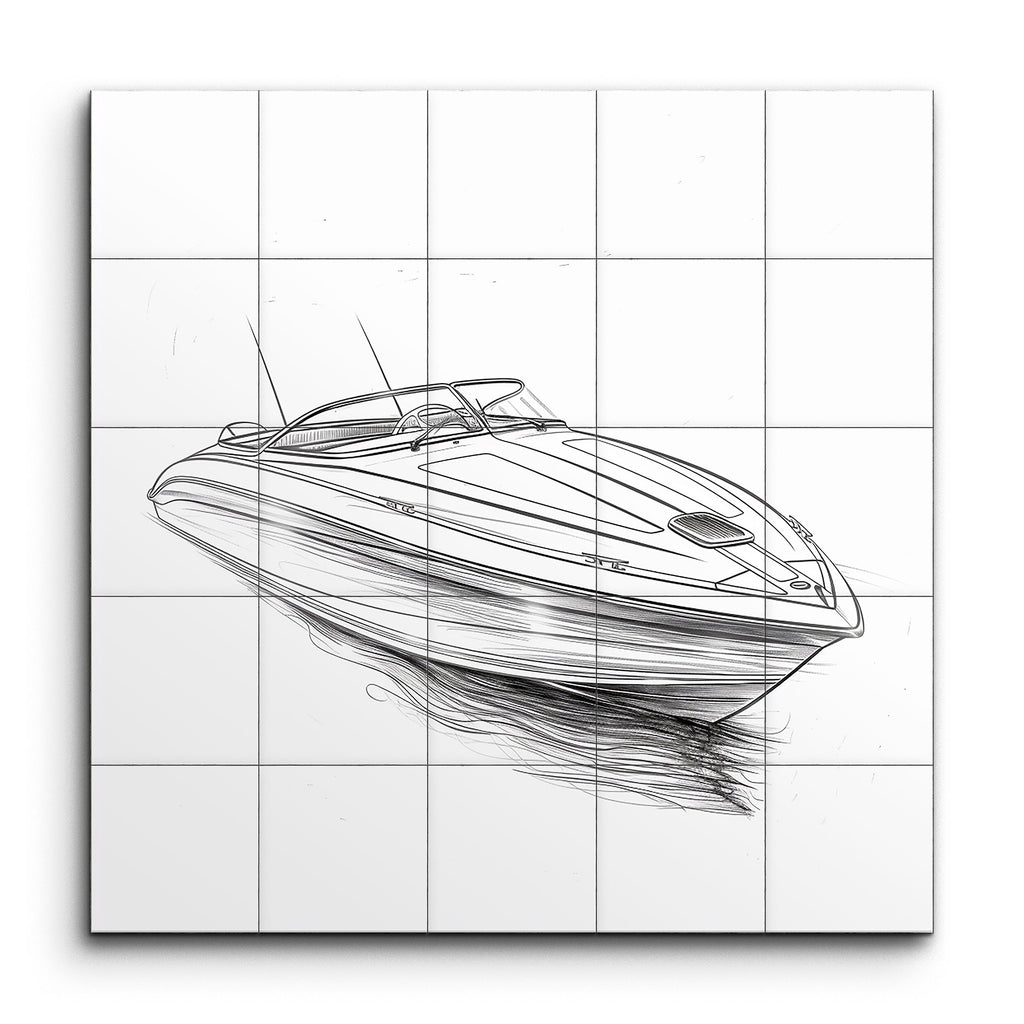 Verwandeln Sie Ihren Raum mit unserem faszinierenden Fliesenbild, das ein elegantes, modernes Schnellboot in einem minimalistischen, skizzenhaften Stil darstellt. Die klaren, präzisen Linien und subtilen Schattierungstechniken erwecken die stromlinienförmige Form und die scharfen Konturen des Bootes zum Leben. Vom detaillierten Windschutz bis zum fließenden Wasser darunter fängt dieses Kunstwerk die Essenz von Geschwindigkeit und Eleganz ein und verleiht jedem Raum einen Hauch von raffinierter Sophistikation.