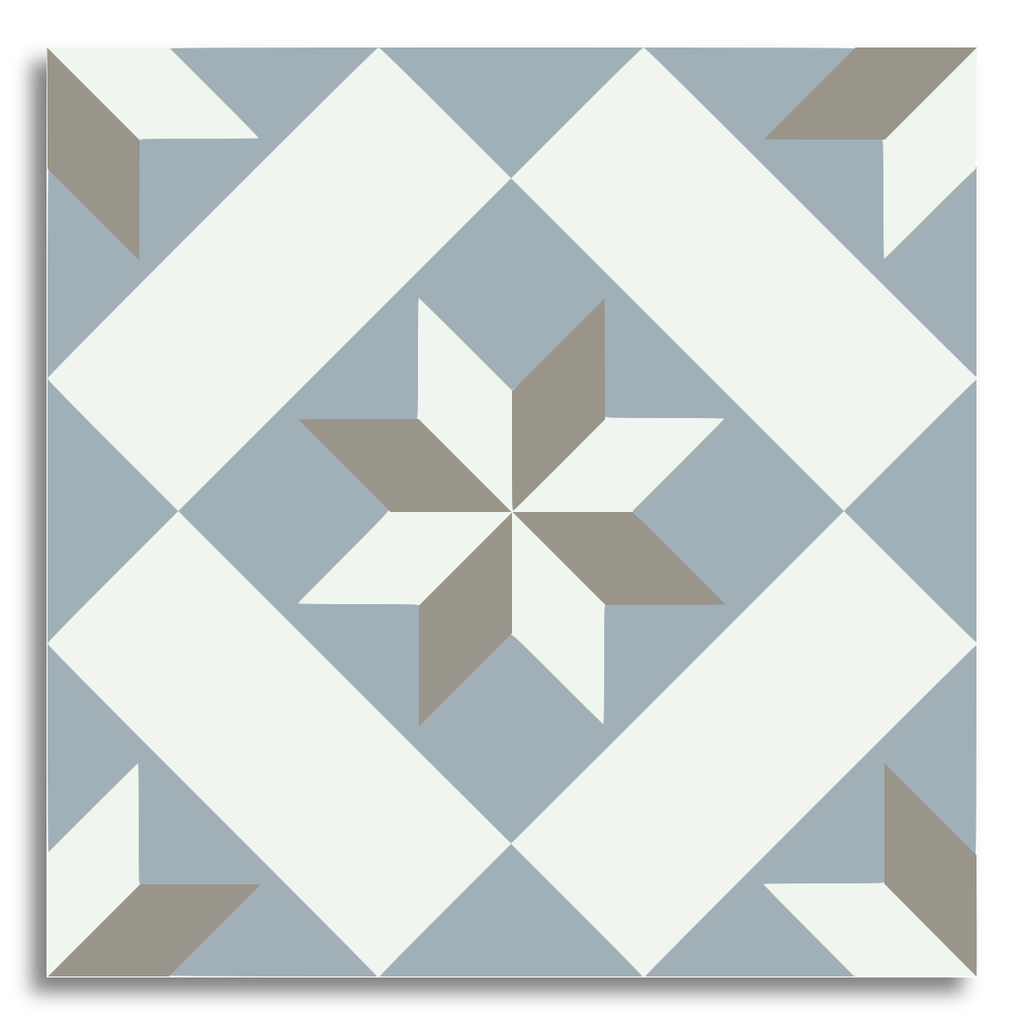 This decor tile showcases a captivating geometric pattern, highlighted by a central star crafted from alternating light and dark gray hues. The star is elegantly framed by diamond shapes and triangles, adding layers of symmetry and balance. With its neutral palette of grays and white, this tile exudes a clean, modern aesthetic, perfect for creating a sophisticated ambiance. Its precise lines and structured form make it a striking addition to any space.