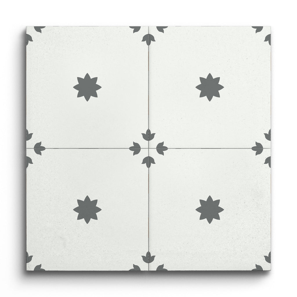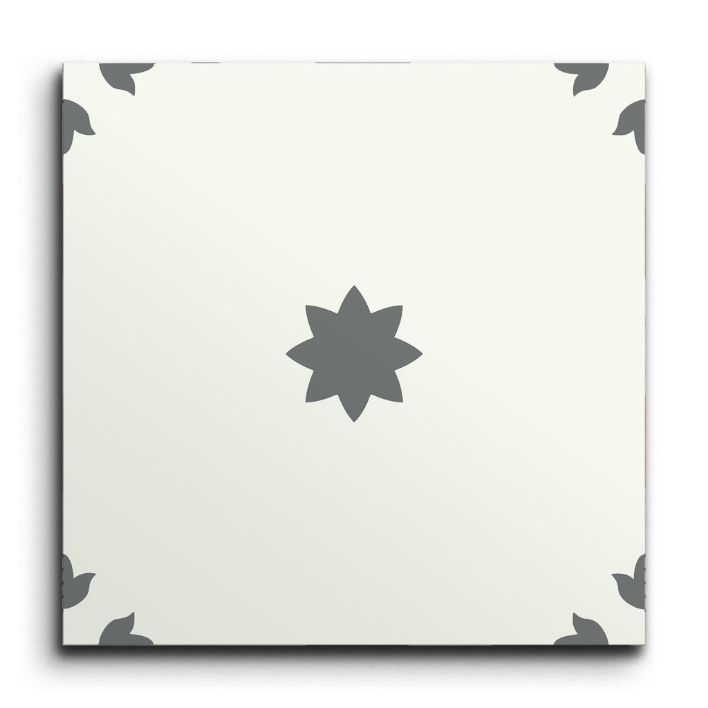 Diese Dekorfliese zeigt eine minimalistische Ästhetik mit ihrem zentralen, dunkelgrauen, sternähnlichen Motiv auf einem klaren weißen Hintergrund. Das Design ist harmonisch mit ähnlichen Motiven in jeder Ecke ausbalanciert, wodurch ein symmetrisches und kohärentes Erscheinungsbild entsteht. Die monochrome Farbpalette und die klaren Linien verkörpern Einfachheit und Eleganz, was sie zu einer idealen Wahl für moderne und zeitgenössische Innenräume macht.