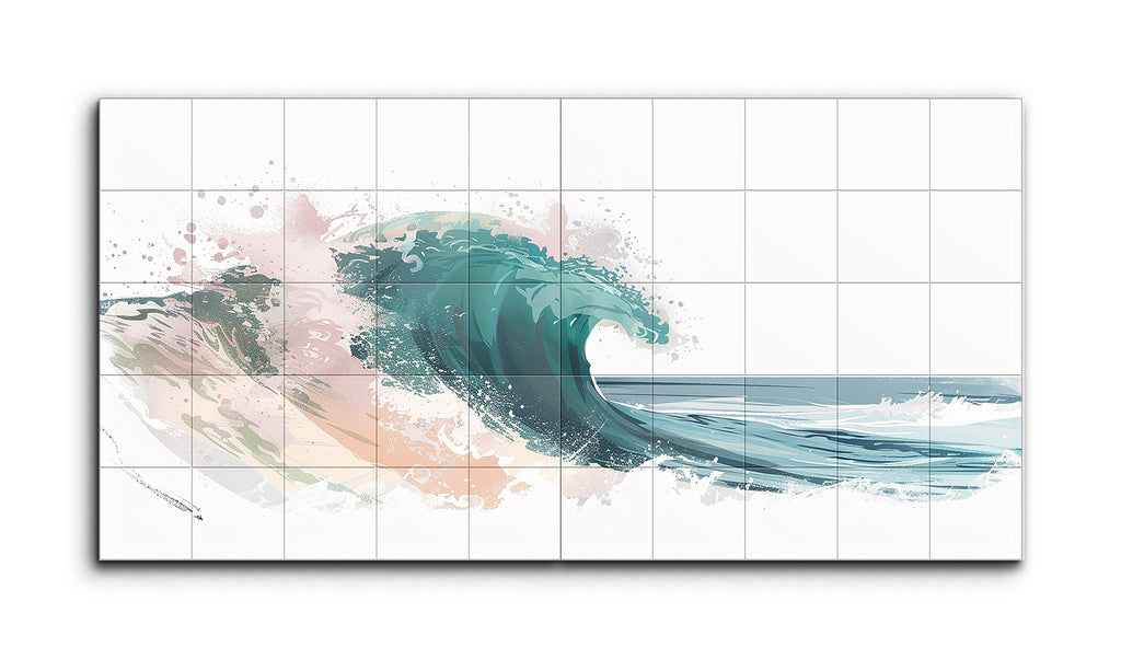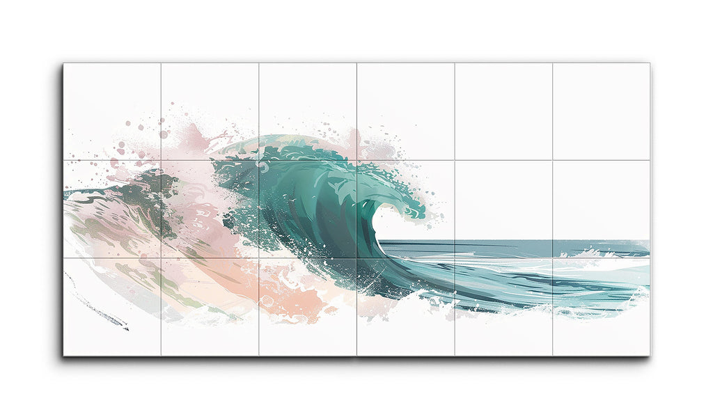 Dieses Diptychon-Fliesenbild fängt eine stilisierte Meereswelle ein, die dynamische Energie und natürliche Schönheit ausstrahlt. Die Welle, dargestellt in kühlen Grüntönen und Blauschattierungen, wird durch Spritzer von Pink und Beige akzentuiert, was Wärme und Komplexität hinzufügt. Fließende Linien und Pinselstriche suggerieren die Bewegung der Welle, wobei hellere Farbtöne ein Gefühl von Transparenz und durchscheinendem Sonnenlicht erzeugen. Die Kombination aus digitaler Malerei und Aquarelltexturen führt zu einer modernen, abstrakten Darstellung, die emotional ansprechend und visuell beeindruckend bleibt.
