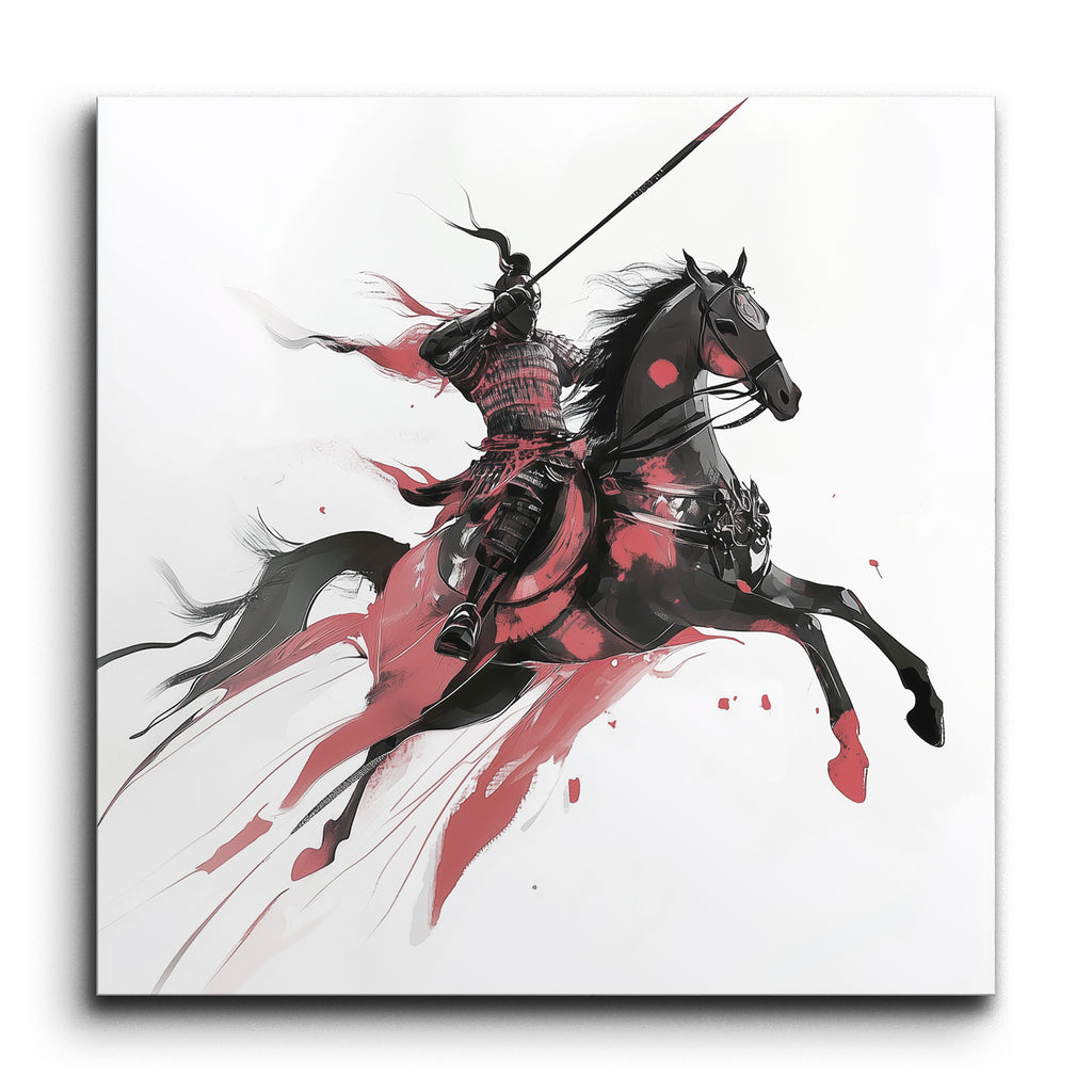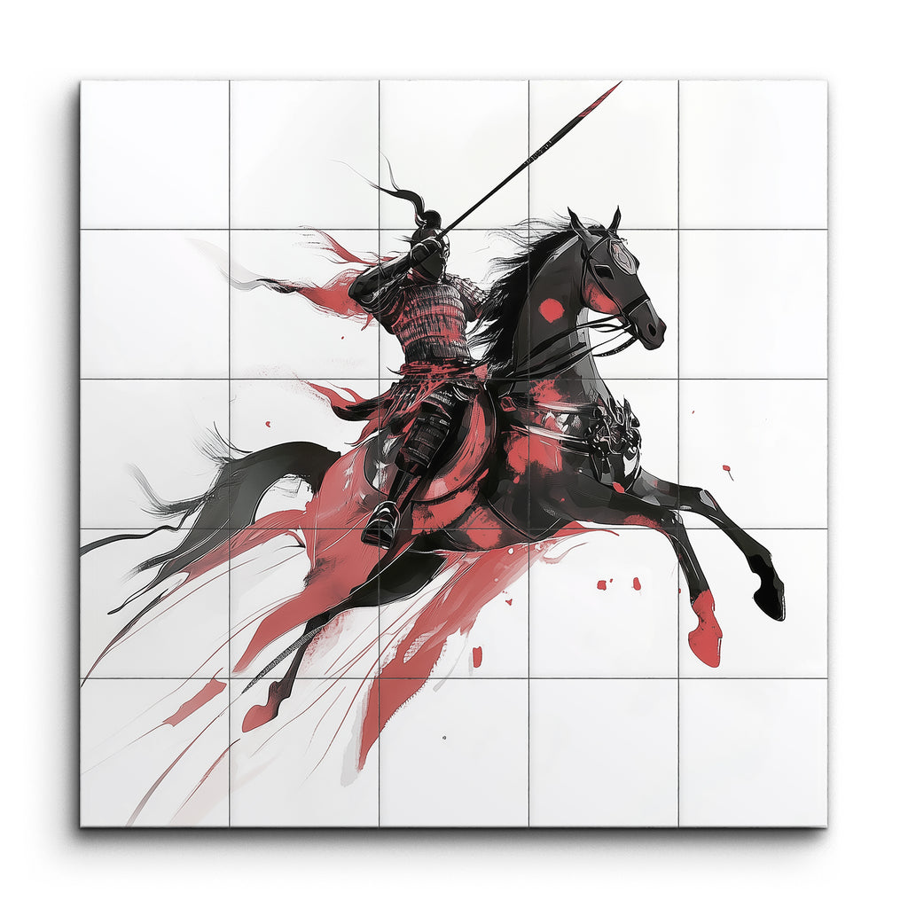 Tauchen Sie ein in die kraftvolle Energie unseres Fliesenmosaiks, das eine dynamische Szene eines Kriegers in traditioneller Rüstung zeigt, der im Galopp auf einem Pferd reitet. Der Krieger, mit hoch erhobenem Schwert, und das Pferd, mit fliegender Mähne, erzeugen ein Gefühl von Bewegung und Aktion. Kräftige Linien und Farbspritzer, überwiegend dunkel mit auffälligen roten Akzenten, vermitteln Dringlichkeit und Intensität. Dieses Kunstwerk verbindet meisterhaft traditionelle und moderne Elemente und resultiert in einer visuell fesselnden und ausgewogenen Komposition, die Aufmerksamkeit erregt.