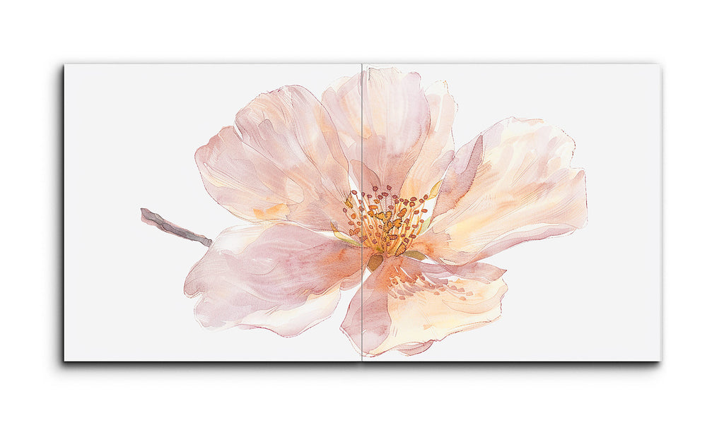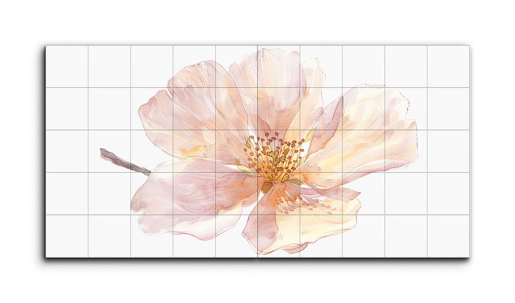 Dieses Fliesenbild zeigt eine zarte Blume, möglicherweise eine Rose oder Wildblume, mit weichen, durchscheinenden Blütenblättern in warmen Tönen von hellem Pfirsich bis zu zartem Rosa. Die halbtransparenten Blütenblätter offenbaren subtile Überlappungen und feine Details, während das Zentrum der Blume zahlreiche goldgesäumte Staubblätter aufweist. An Aquarellmalerei erinnernd, verschmelzen die Farben fließend und erzeugen einen sanften, ätherischen Effekt. Ein schlichter Hintergrund betont die Blume und hebt ihre Ruhe und natürliche Schönheit hervor.