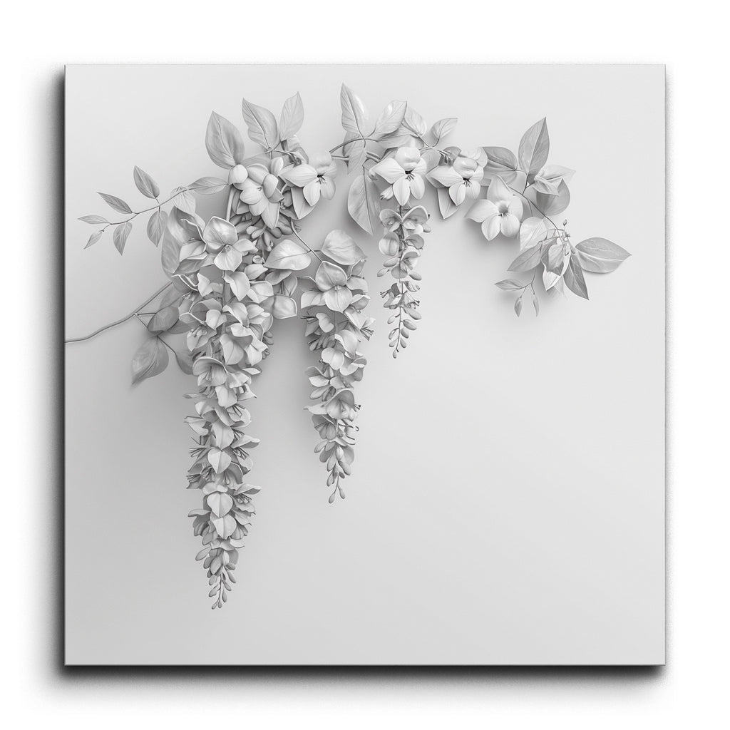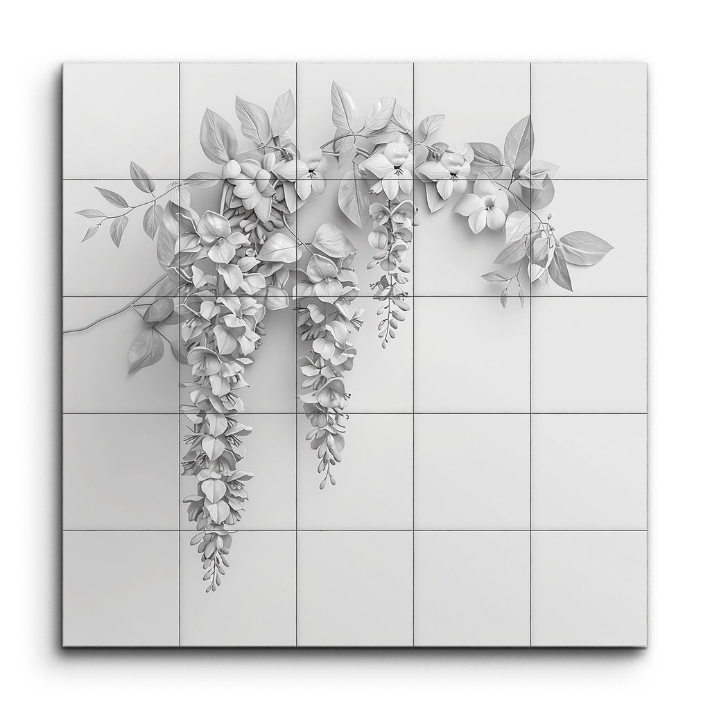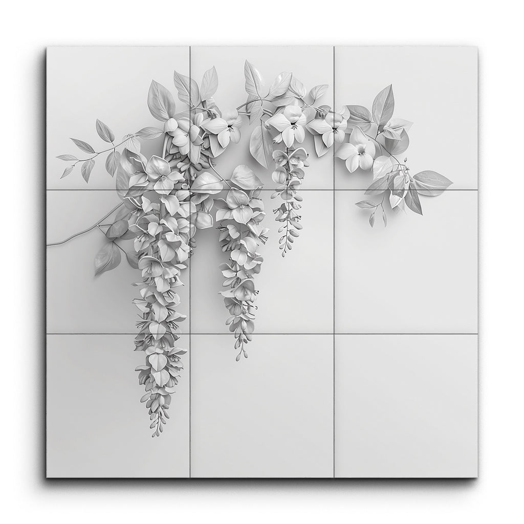 Erleben Sie die ruhige Eleganz der Natur mit unserem exquisiten Fliesenbild, das eine lebensechte Darstellung von herabfallenden Glyzinienblüten und üppigen Blättern zeigt. Jedes Blütenblatt und jedes Blatt ist sorgfältig gestaltet, um ihre zarten Texturen und natürlichen Kurven einzufangen. Die monochromen Töne schaffen eine zeitlose und beruhigende Ästhetik, die die feinen Details und die anmutige Komposition hervorhebt. Dieses Mosaik lädt Sie ein, in die verfeinerte Schönheit der Natur einzutauchen und bietet einen anspruchsvollen und friedlichen Blickfang für jeden Raum.