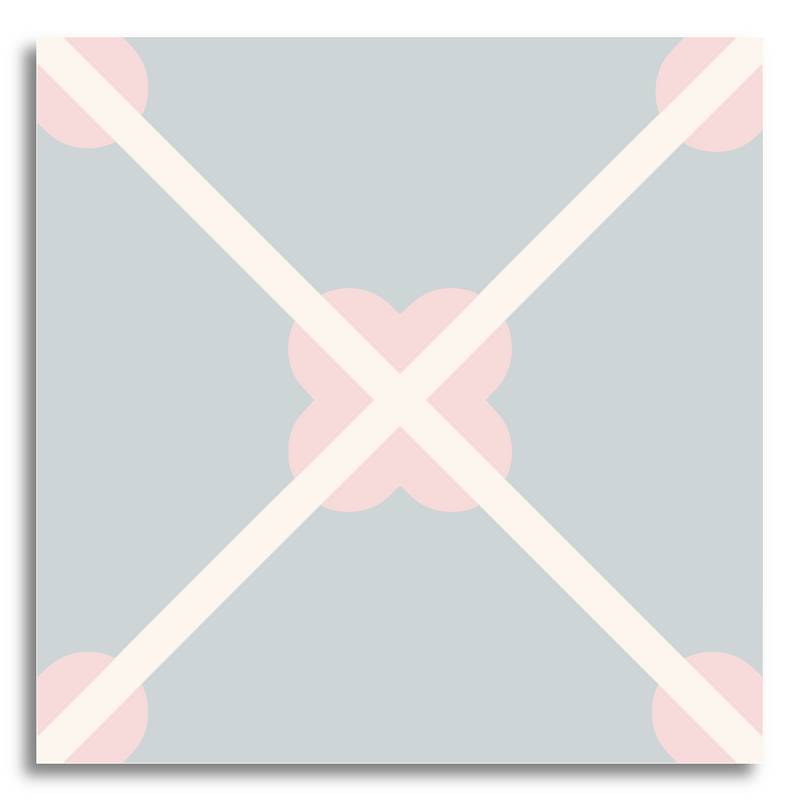 This decor tile presents a captivating geometric pattern with intersecting lines that form an "X" across its surface. At the heart of the design lies a symmetrical shape, reminiscent of a stylized flower or clover, bringing a touch of elegance to the overall look. The corners feature quarter-circle shapes, enhancing the geometric appeal. With a color palette of soft gray and white, the tile exudes a clean, modern aesthetic, balancing simplicity with striking visual impact.