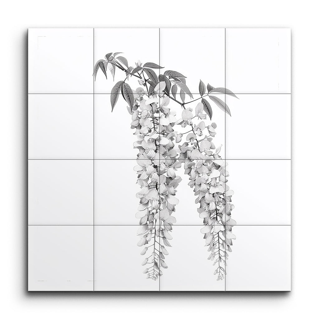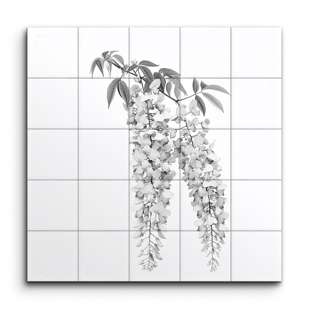 Tauchen Sie Ihren Raum in zeitlose Eleganz mit diesem faszinierenden Fliesenbild, das eine sorgfältig illustrierte hängende Glyzinie zeigt. In monochromem Graustufen gehalten, hebt das Kunstwerk herabfallende Blütenbüschel mit detaillierten Blütenblättern und sorgfältig geäderten Blättern hervor. Der realistische Stil, betont durch feine Linien und Schattierungen, schafft ein Gefühl von Tiefe und Dimension und feiert die natürliche Schönheit der Glyzinie. Dieses Stück bringt einen Hauch von Raffinesse und Ruhe in jede Umgebung.