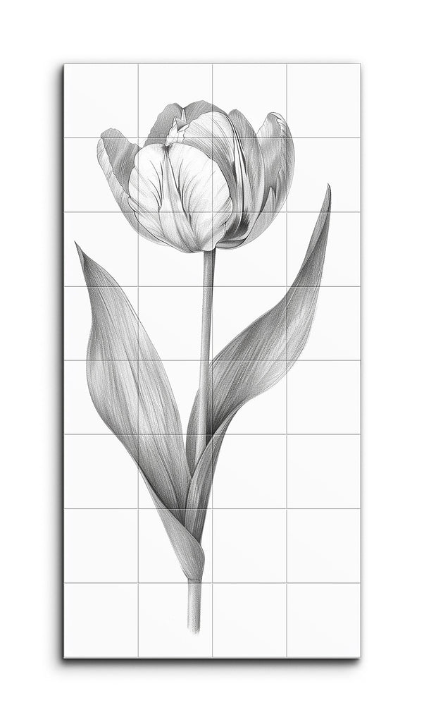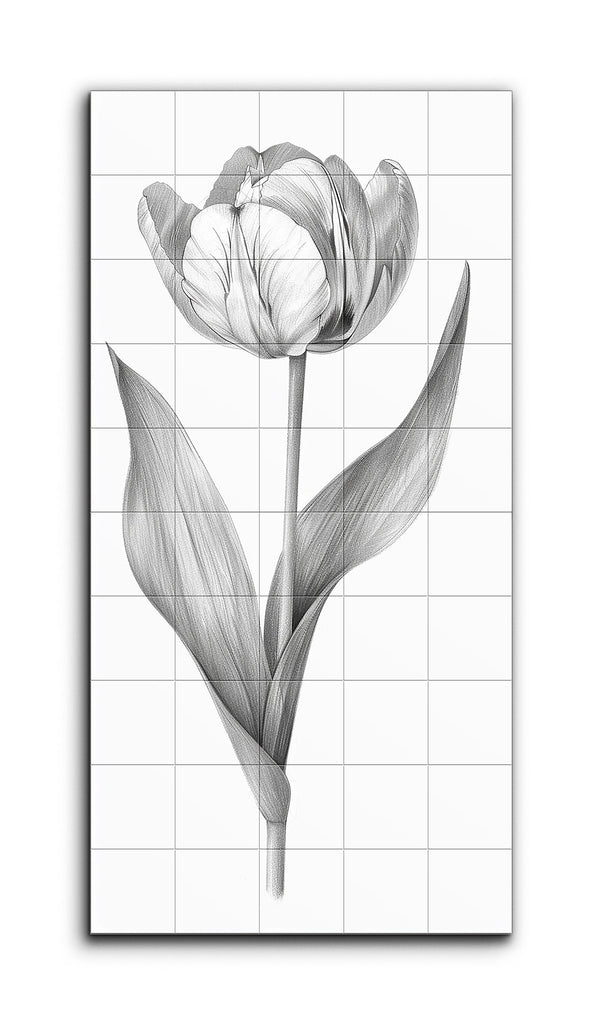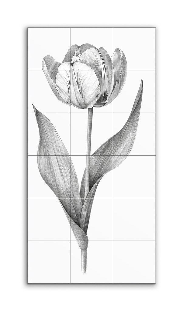 Dieses Fliesenbild zeigt eine detaillierte, monochromatische Illustration einer Tulpe, die mit präzisen, feinen Linien gezeichnet ist, um die Textur und Form der Blume zu betonen. Die kunstvoll gezeichneten Blütenblätter zeigen zarte Adern und subtile Schattierungen, die ihnen ein lebensechtes, dreidimensionales Aussehen verleihen. Verlängerte, anmutig gebogene Blätter mit detaillierten Streifen ergänzen den schlanken, geraden Stiel. Der hochrealistische Stil, der an traditionelle botanische Illustrationen erinnert, verwendet Schwarz und Weiß, um den Fokus auf Form und Textur zu verstärken und eine zeitlose und elegante Ästhetik zu schaffen.